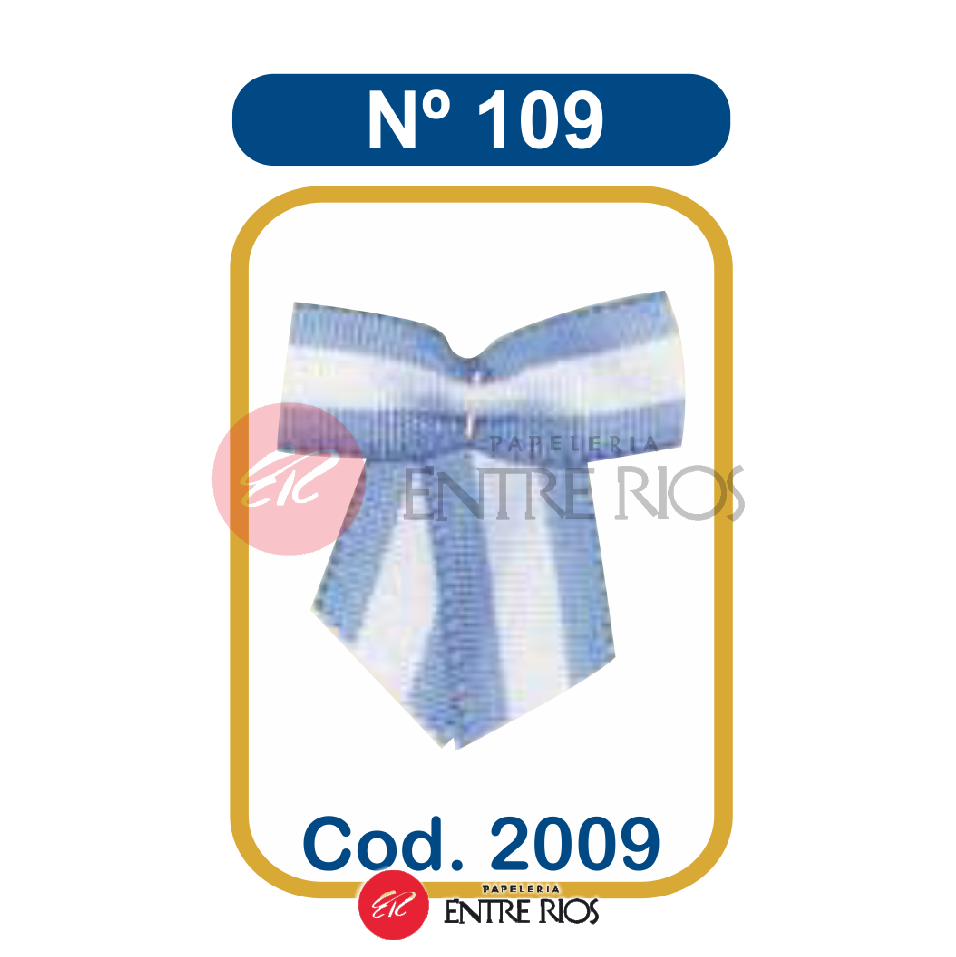 Tipo: moño doble con colitas. Material: rayón. Colores: celeste y blanco (colores de la bandera argentina). Referencia: (109) según la denominación del producto. Uso: distintivo patrio para eventos cívicos y escolares. Tamaño/dimensiones y peso: no especificados en fuentes oficiales o verificables. Sistema de sujeción: no especificado. Otras características técnicas no disponibles en fuentes oficiales.