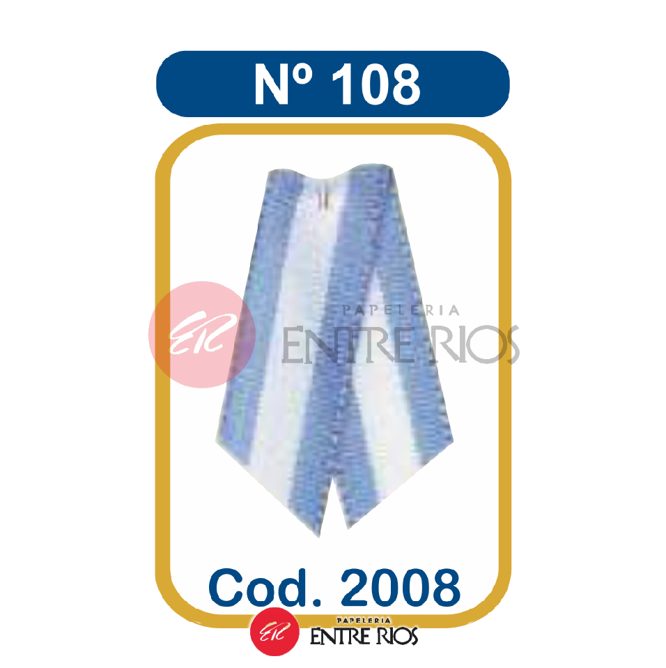 Tipo: escarapela simple. Colores: celeste y blanco. Material: rayón. Identificación del modelo/tamaño: “108” según denominación comercial. No se encontraron en fuentes oficiales verificables datos precisos sobre diámetro, sistema de sujeción o peso.