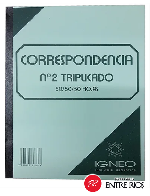 Tipo: libro de correspondencia por triplicado (3 vías). Formato: Nº 2. Tamaño: 17 x 22 cm. Contenido: 50 juegos. Marca: Igneo.