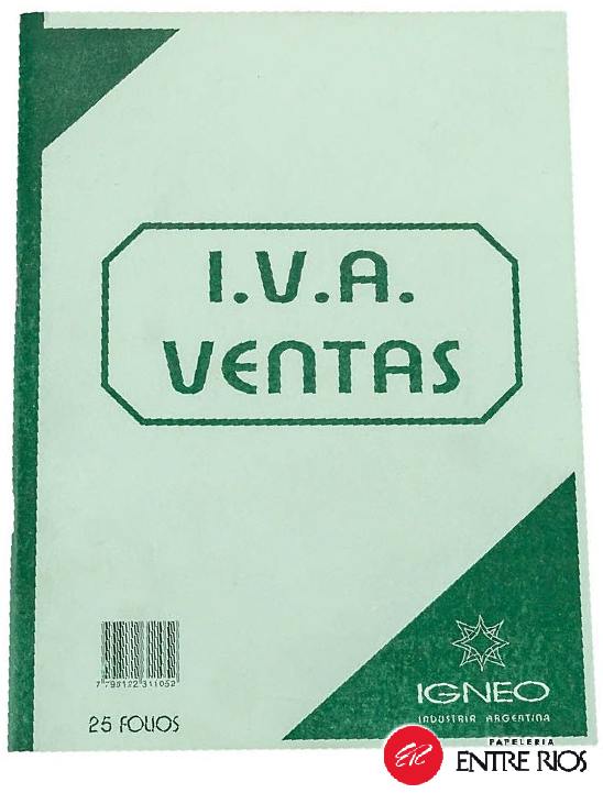 Tipo: libro contable IVA Ventas; tamaño: 20 x 27 cm; tapa: flexible; contenido: 25 folios; materiales: interior de papel y tapa flexible (material no especificado); color: no especificado.