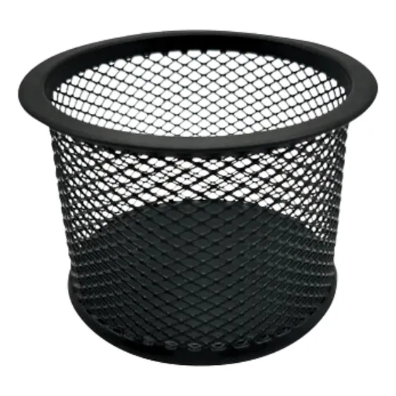 Portalápiz metálico enrejado de tamaño chico y color negro, ideal para organizar útiles escolares o de oficina.